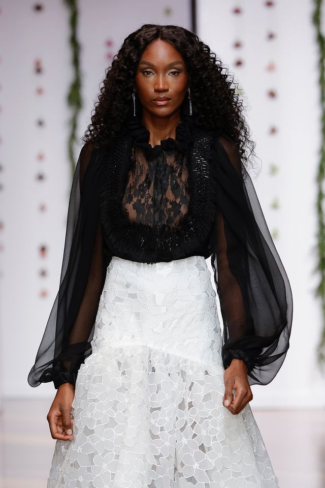 Camisa negra de bambula de seda, con pechero de encaje a tono que introduce un detalle de refinamiento inesperado, combinada con una falda larga blanca hecha en organza de seda bordada con motivos florales. Esta unión inusual de camisa oscura con falda nupcial blanca aporta carácter, modernidad y elegancia.