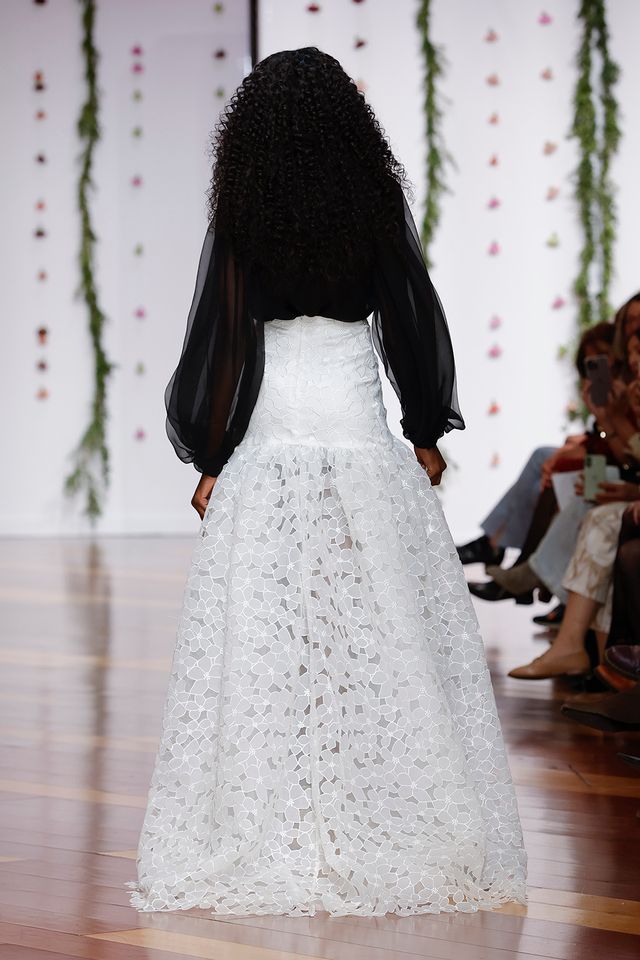 “Camisa negra y falda blanca. ’Aurora’ es el equilibrio perfecto entre rebeldía y romanticismo. La novia que rompe esquemas y sigue siendo pura elegancia.”