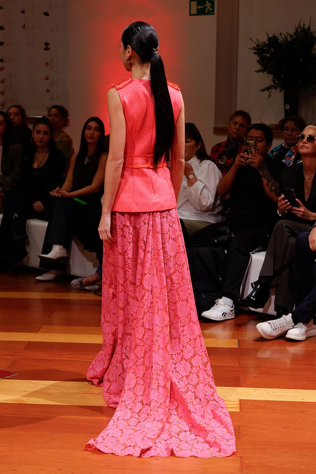 ‘Luna’ es el amanecer hecho vestido. Naranja y rosa se entrelazan en una danza de encaje y pedrería, donde el cuerpo irradia sofisticación y la falda fluye con elegancia, formando una silueta larga y majestuosa que termina en una delicada cola.